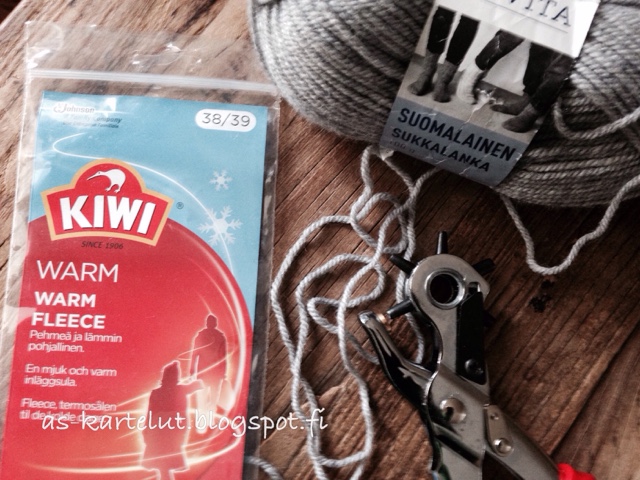 Tarvitset pohjalliset (minulla lämminpohjalliset, joissa toinen puoli pitävää lateksia), reikäpihit, sukkalankaa ja virkkukoukun (noin koko 4). Lisäksi neulan lankojen päättelyyn ja mahdollisen nauhan koristeeksi.